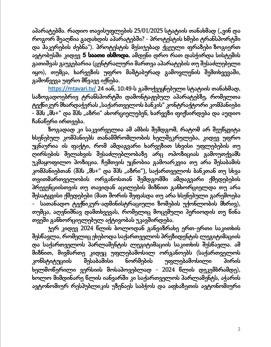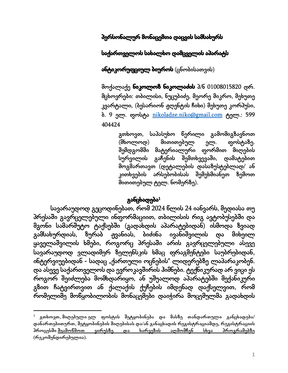 განცხადება წარმოდგენილია როგორც ჟურნალისტური საქმიანობის განმახორციელებელი პირის მიერ. ამ და სხვა განცხადების წარმოდგენით, ვსარგებლობ კონსტიტუციის მე-18 მუხლის 1-ელი პუნქტით და საქართველოს ზოგადი ადმინისტრაციული კოდექსის მე-12 მუხლით გარანტირებული უფლებებით და კორუფციის შესახებ საქართველოს კანონის 21-1 და 21-4 მუხლების გათვალისწინებითაც. სიტყვისა და გამოხატვის თავისუფლების შესახებ საქართველოს კანონის თანახმად, მედია განმარტებულია, როგორც მასობრივი კომუნიკაციის ბეჭდვითი ან ელექტრონული საშუალება, მათ შორის, ინტერნეტი. საქართველოს კონსტიტუციის მე-18 მუხლის 1-ელი და მე-2 პუნქტების (1. ყველას აქვს ადმინისტრაციული ორგანოს მიერ მასთან დაკავშირებული საქმის გონივრულ ვადაში სამართლიანად განხილვის უფლება. 2. ყველას აქვს უფლება კანონით დადგენილი წესით გაეცნოს საჯარო დაწესებულებაში მასზე არსებულ ან სხვა ინფორმაციას ან ოფიციალურ დოკუმენტს, გარდა იმ შემთხვევისა, როდესაც იგი შეიცავს კომერციულ ან პროფესიულ საიდუმლოებას ან დემოკრატიულ საზოგადოებაში აუცილებელი სახელმწიფო ან საზოგადოებრივი უსაფრთხოების ან სამართალწარმოების ინტერესების დასაცავად კანონით ან კანონით დადგენილი წესით აღიარებულია სახელმწიფო საიდუმლოებად).და საქართველოს ზოგადი ადმინისტრაციული კოდექსის მე-12 მუხლის 1-ელი და მე-2 პუნქტების (ნებისმიერ პირს აქვს უფლება მიმართოს ადმინისტრაციულ ორგანოს ამ უკანასკნელის უფლებამოსილებას მიკუთვნებული იმ საკითხის გადასაწყვეტად, რომელიც უშუალოდ და პირდაპირ ეხება პირის უფლებებსა და კანონიერ ინტერესებს. 2. თუ კანონით სხვა რამ არ არის დადგენილი, ადმინისტრაციული ორგანო ვალდებულია განიხილოს მის უფლებამოსილებას მიკუთვნებულ საკითხზე შეტანილი განცხადება და მიიღოს შესაბამისი გადაწყვეტილება) გათვალისწინებითაც,