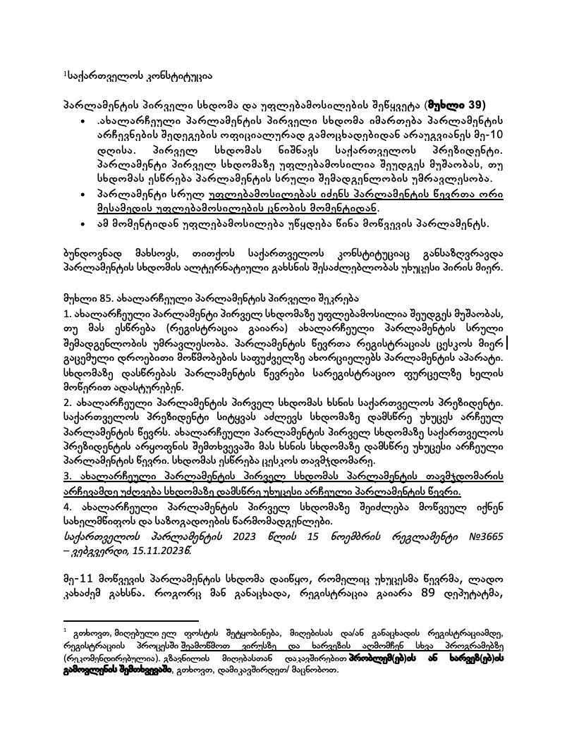 11) ზემოხსენებული სამართლებრივი აქტების ანალიზი, მითუმეტეს - რომ პარლამენტმა რეგლამენტი 2025 წლის 1 ივლისს დაამტკიცა და გაანალიზებული ექნებოდა სხვა სამართლებრივი აქტებით წარმოშობილი თანხვედრი პროცედურები. შესაბამისად, მე მიჩნდება ეჭვი, რომ ხელისუფლებამ და პარლამენტმა განზრახ მოახდინა მამუკა მდინარაძის კანდიდატურის არამართლზომიერი პროცედურებით არჩევა, რამეთუ თვითმართველობის არჩევნების შემდგომ განვითარებული (დადგმული) პროცესების შედეგად დაკავებული პირების მიერ საკითხის გასაჩივრების შედეგად, ისინი გათავისუფლდნენ, რაც შესაძლოა ნაციონალური მოძრაობის ე.წ. ლიდერშიფთან შეთანხმების საგანი ყოფილიყო.